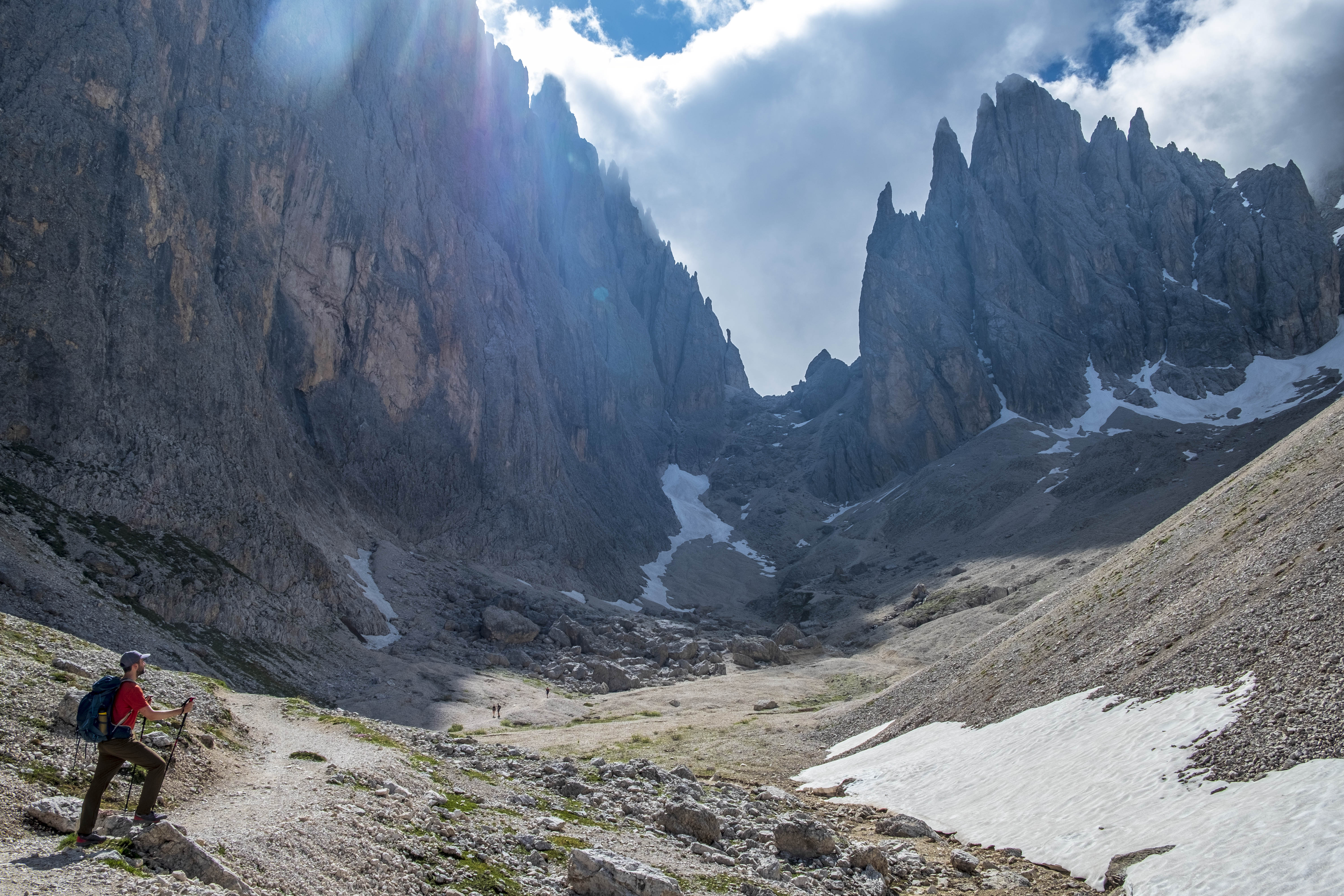 We are at the mouth of a gorge that winds its way between dolomite walls, always jagged, broken up by sharp towers, pinnacles and finally scree at their end. A scenario that is repeated in our hikes, but which always has the power to amaze us each time.
