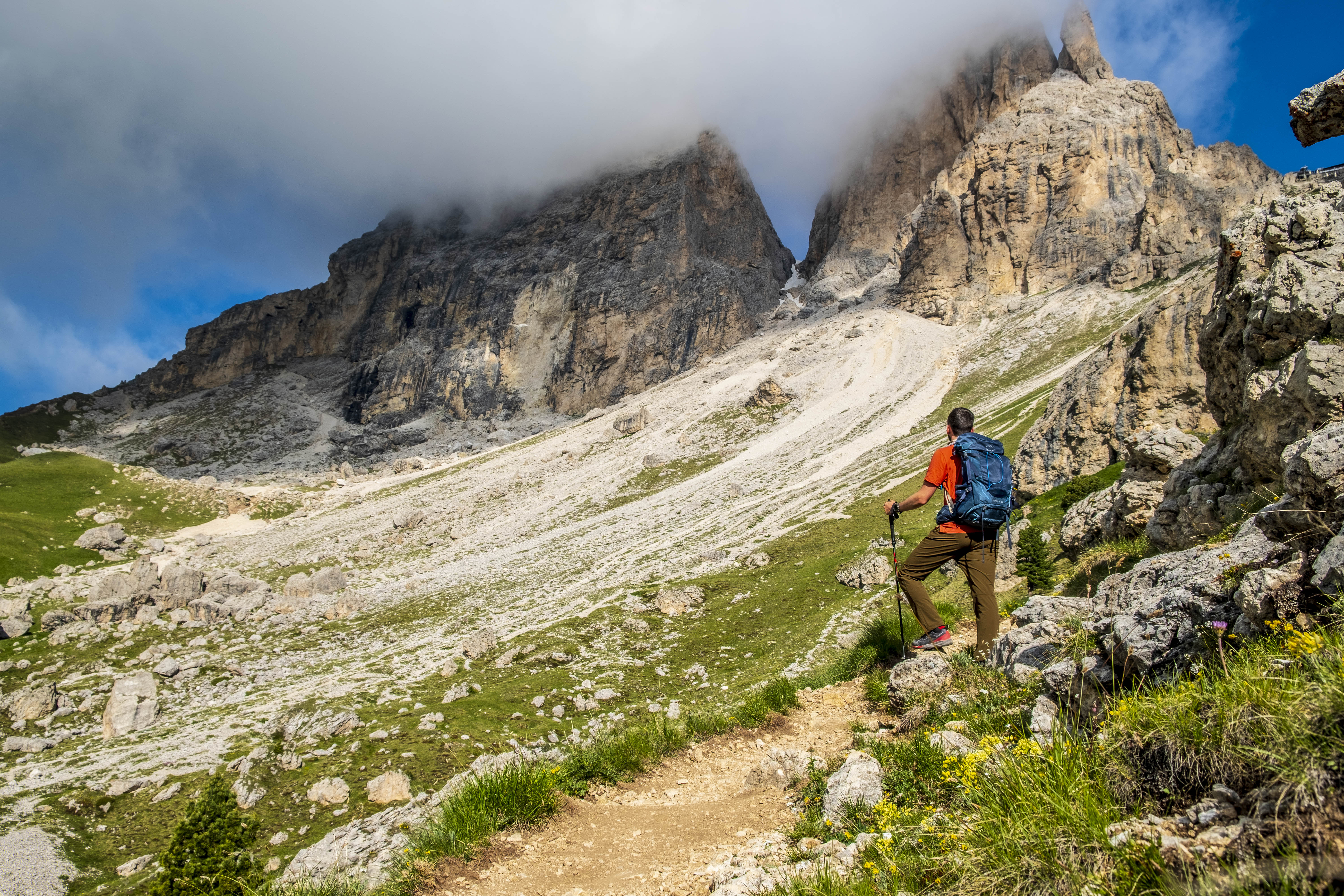 The climb is steep, the mind flies, our gaze always fixed upwards towards the pass to be reached, while behind us the Dolomites of the Sella group and Marmolada peep through the clouds. Forcella Sassolungo awaits us at the end of this ascent, in a rocky saddle guarded by Rifugio Toni Demetz. A few residual late spring snowfields serve as an introduction to what now awaits us, the most sensational section of this itinerary.