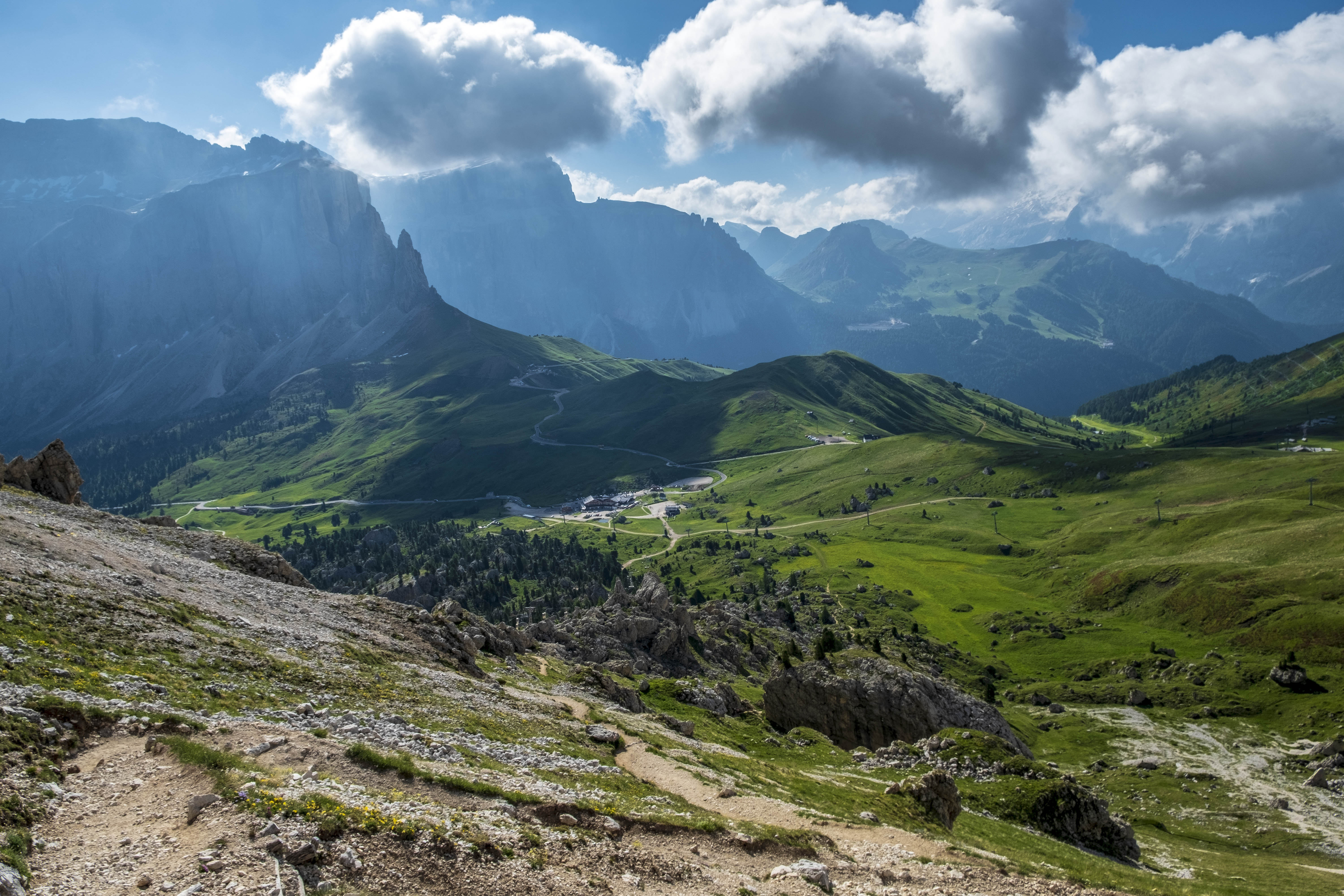 We reach Passo Sella, where starts a path that we find unusually isolated and unfrequented. It may be the time of day, it may be the early season: in any case, the intuition turns out to be right, and climbing up in silence the path that zig-zags across the scree at the foot of the Dolomites walls is something thrilling. The pale rocks dot the green meadows, at that altitude where every step is marked by renewed wonder.