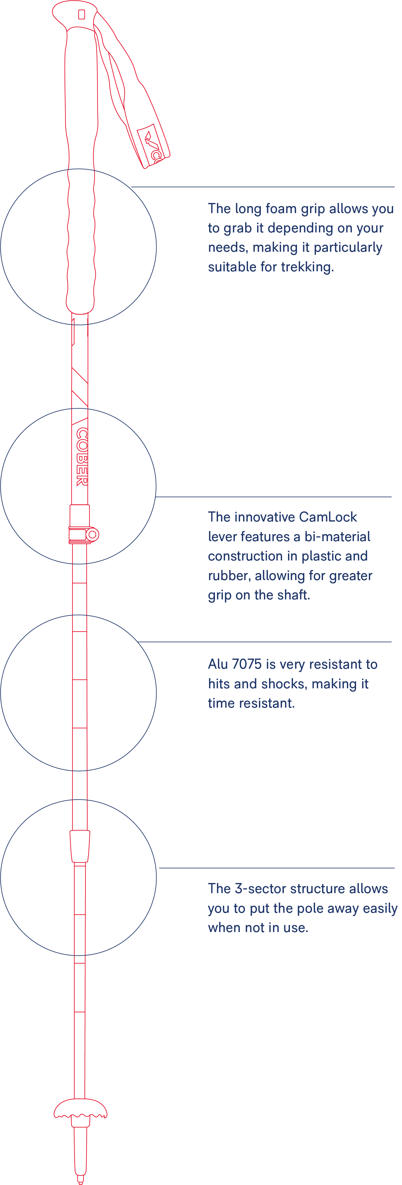 Artemisia is a pair of trekking poles with a long ergonomic foam handle, which allows for different grips, making it suitable for every situation. They are adjustable by a lever and a expander and are made of ergal, an aluminium that is particularly resistant to hits and shocks.