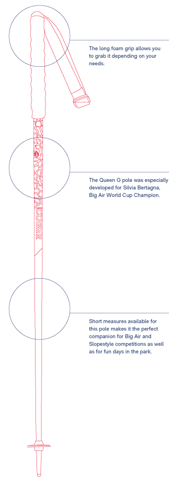 Queen G is the special edition of freestyle ski poles designed in collaboration with Silvia Bertagna, Big Air champion! Short, with a grip suitable for Big Air and Slopestyle competitions, and with a unique design. Are you ready to take a ride in the park and enjoy the adrenaline rush of your first trick?