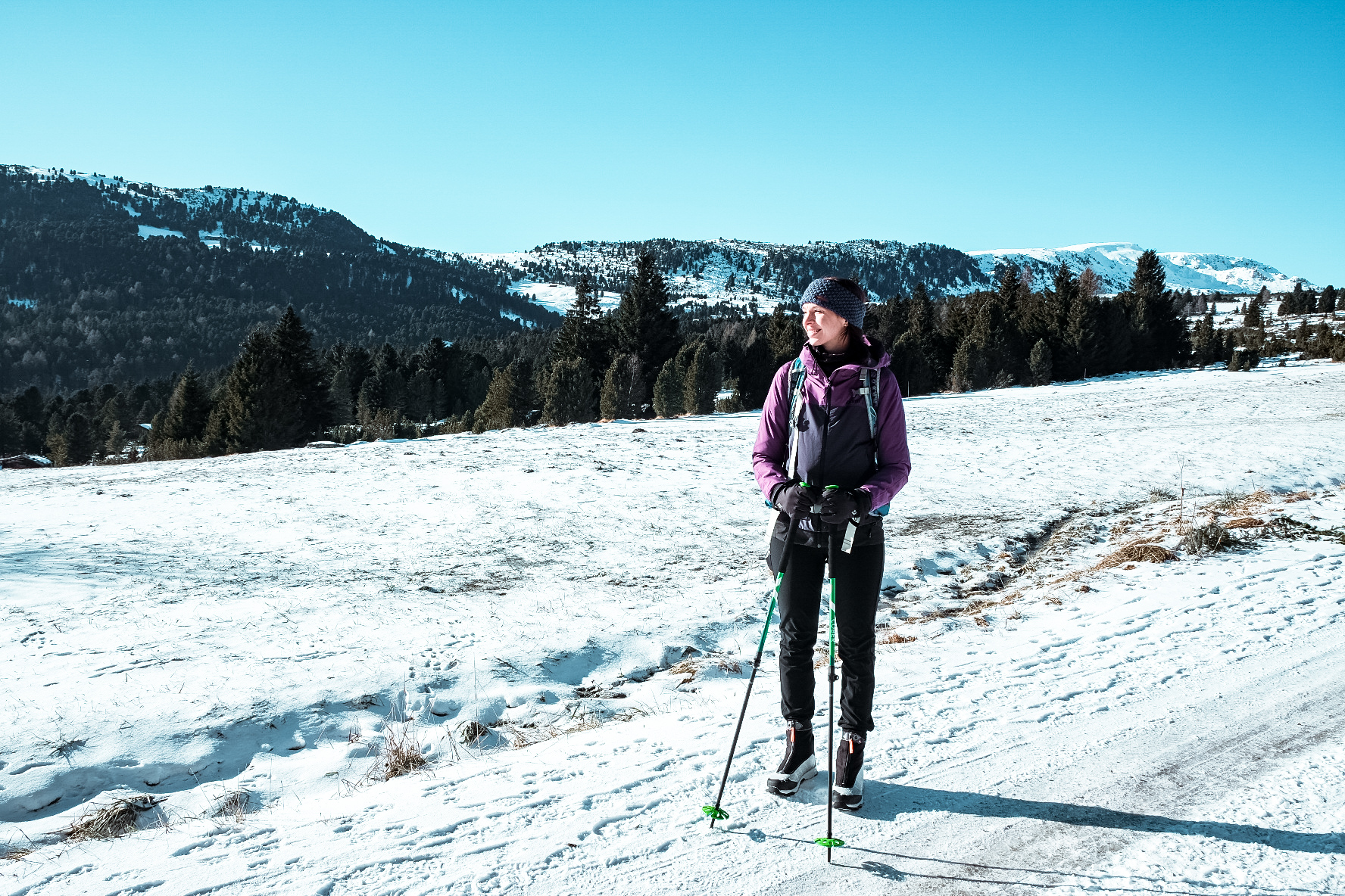 In un successivo tratto, il sentiero si sviluppa ancora senza eccessiva pendenza, quasi muovendosi in piano, lungo un’ampia stradina delimitata da una staccionata di legno. Essendo all’inizio della stagione invernale, il manto nevoso non presenta ancora uno spessore notevole. Per questo incontriamo alcuni tratti completamente ghiacciati, da aggirare meticolosamente percorrendo alcuni passi nella neve più fresca, dove i bastoncini invernali PowPow garantiscono l’appoggio necessario per non perdere l’equilibrio, grazie anche alla rotella in dotazione, che impedisce ai bastoncini di sprofondare nella neve senza creare attrito.