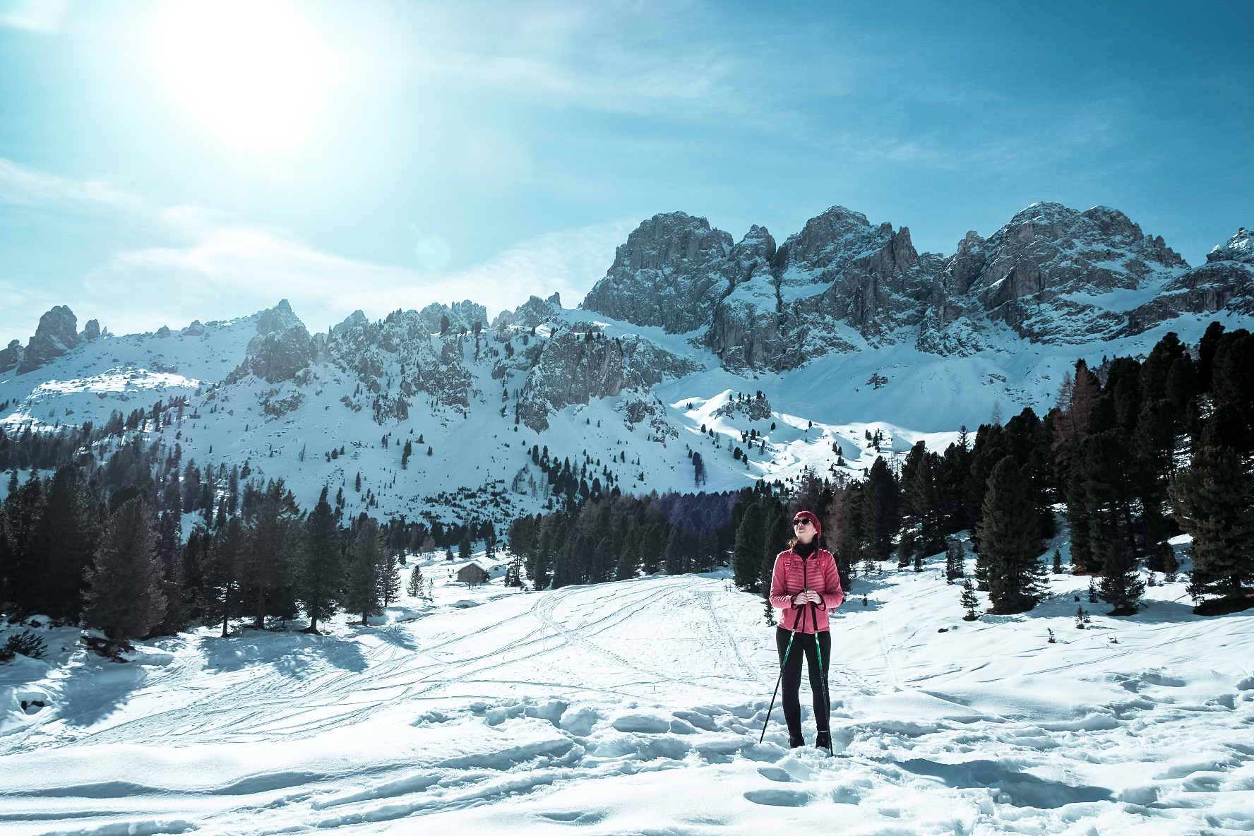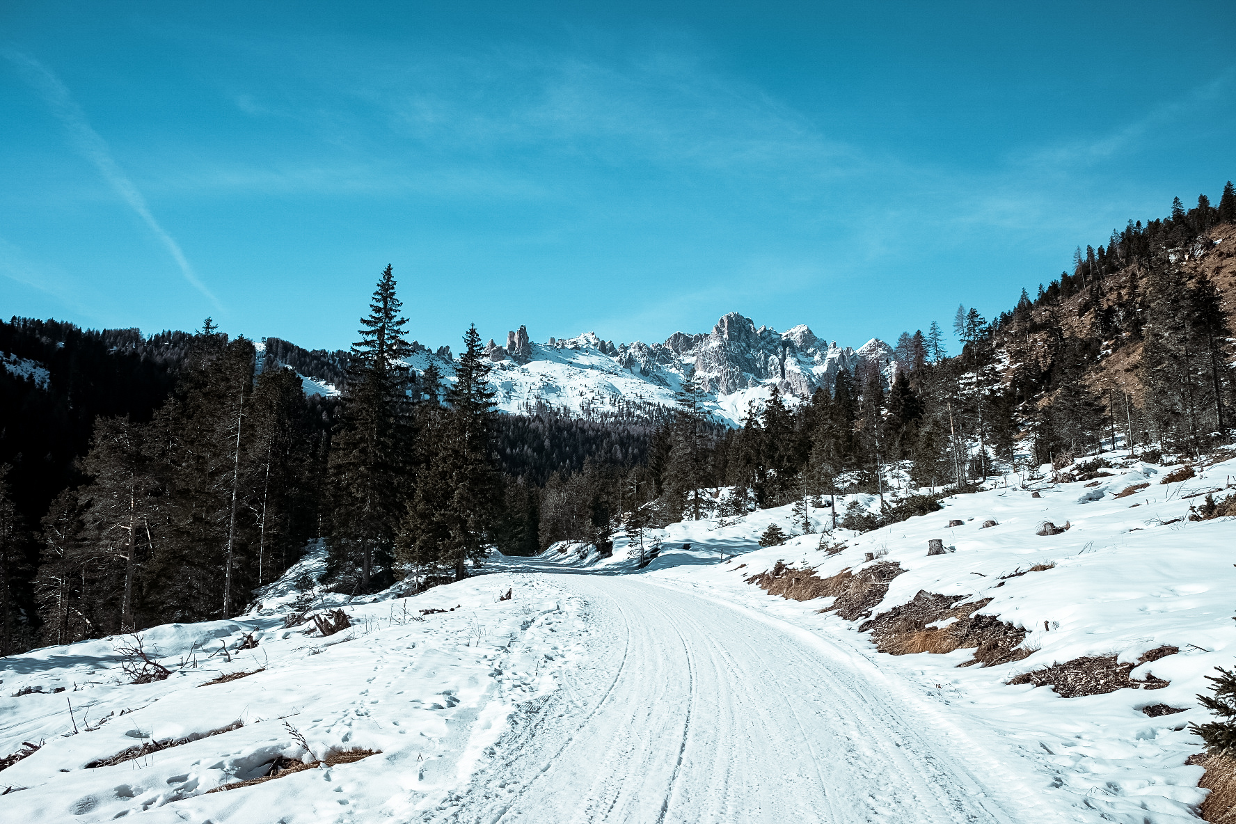 La nostra strada prosegue in leggera salita fino ad affrontare alcuni tornanti che ci fanno guadagnare quota. Da qui in avanti comincia a schiudersi di fronte a noi la conca circondata dalle pareti del Catinaccio. Alle nostre spalle in lontananza compare invece la Marmolada con il profilo della sua iconica e più alta Punta Penia. Il bianco della neve caratterizza sicuramente questo paesaggio invernale, nonostante alcuni scorci di terreno decisamente primaverile comincino a farsi già largo nella vegetazione, dovuti ad un rialzo repentino delle recenti temperature.