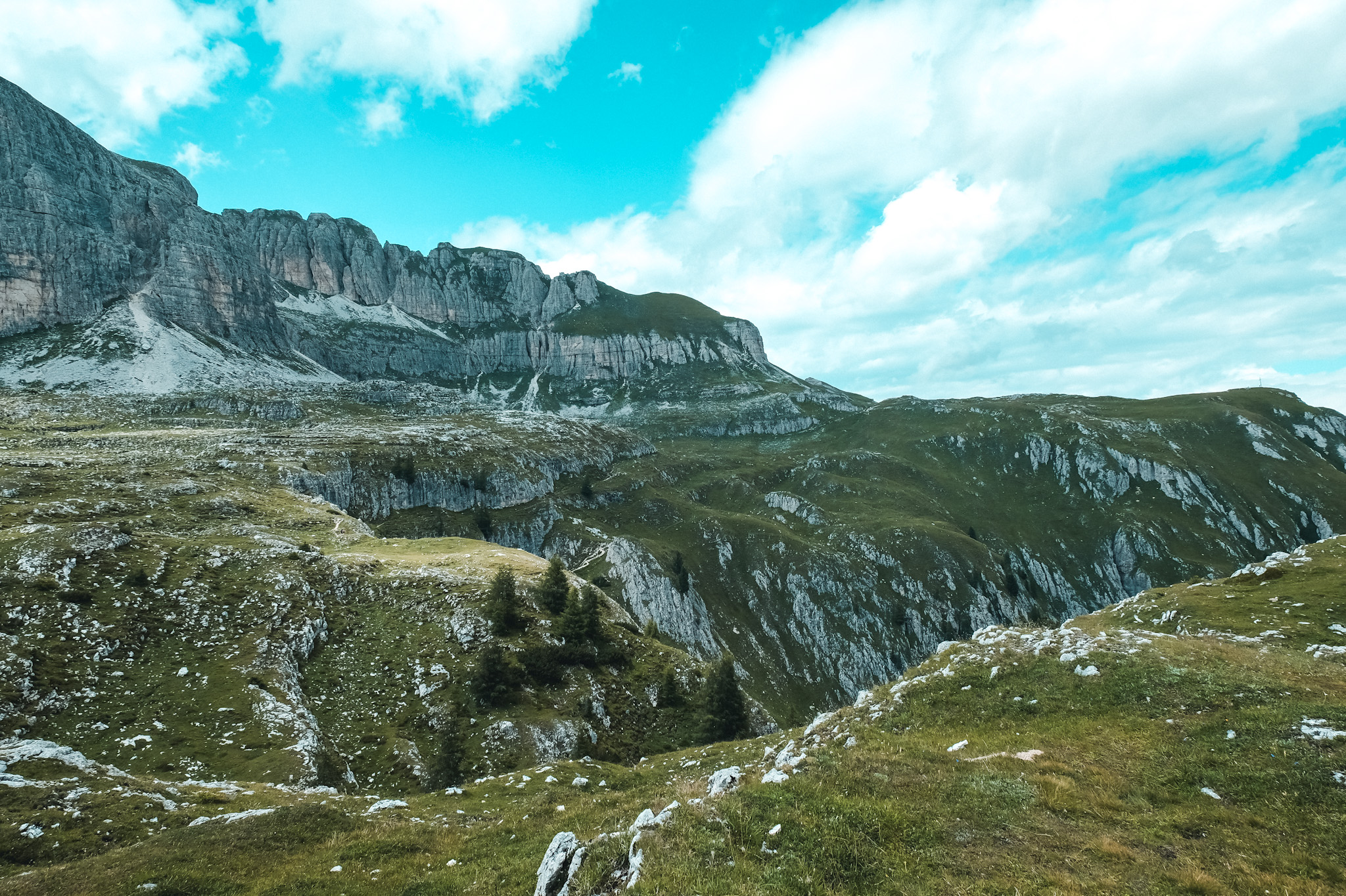 Le ultime aree dell’altipiano raggiunte dalla vegetazione lasciano spazio ad una spettacolare e verde distesa erbosa, puntellata da numerose e chiare rocce. Un tipico panorama dolomitico, con le pareti alla nostra sinistra che si dispiegano su scenografici ed emozionanti gradoni rocciosi. Alcuni di questi si spingono fino ad incrociare il sentiero, creando alcuni passaggi più stretti ed a contatto con paretine rocciose, dove le mani stringono maggiormente i bastoncini da trekking per l’appoggio che garantiscono.