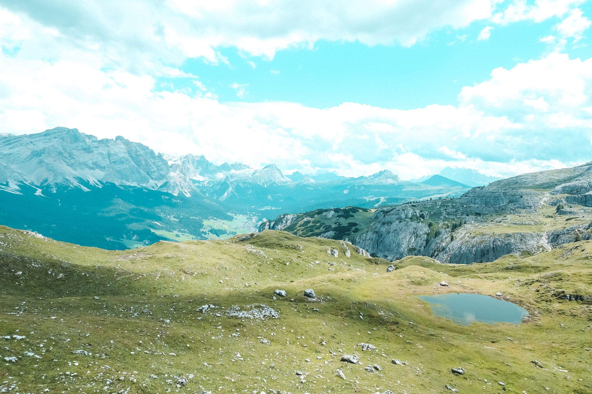 Un’emozione che si sviluppa così man mano, in questo sentiero dove il panorama si scopre sempre di più, per poi culminare in un lungo tratto di cammino in cui siamo circondati dalle Dolomiti. Alla nostra destra le grandiose pareti di roccia chiara si stagliano con le loro vette frastagliate sopra la Val Badia. A sinistra invece il gruppo del Puez ci mostra le porte d’accesso al suo altipiano roccioso, con alcune ampie gradinate che sovrastano i verdi pendii che stiamo attraversando, facendo da teatro e palcoscenico a questo spettacolo naturale.