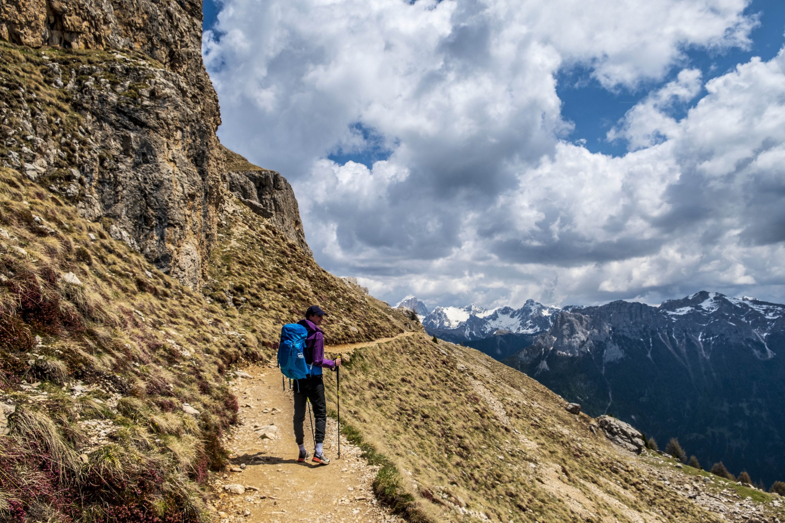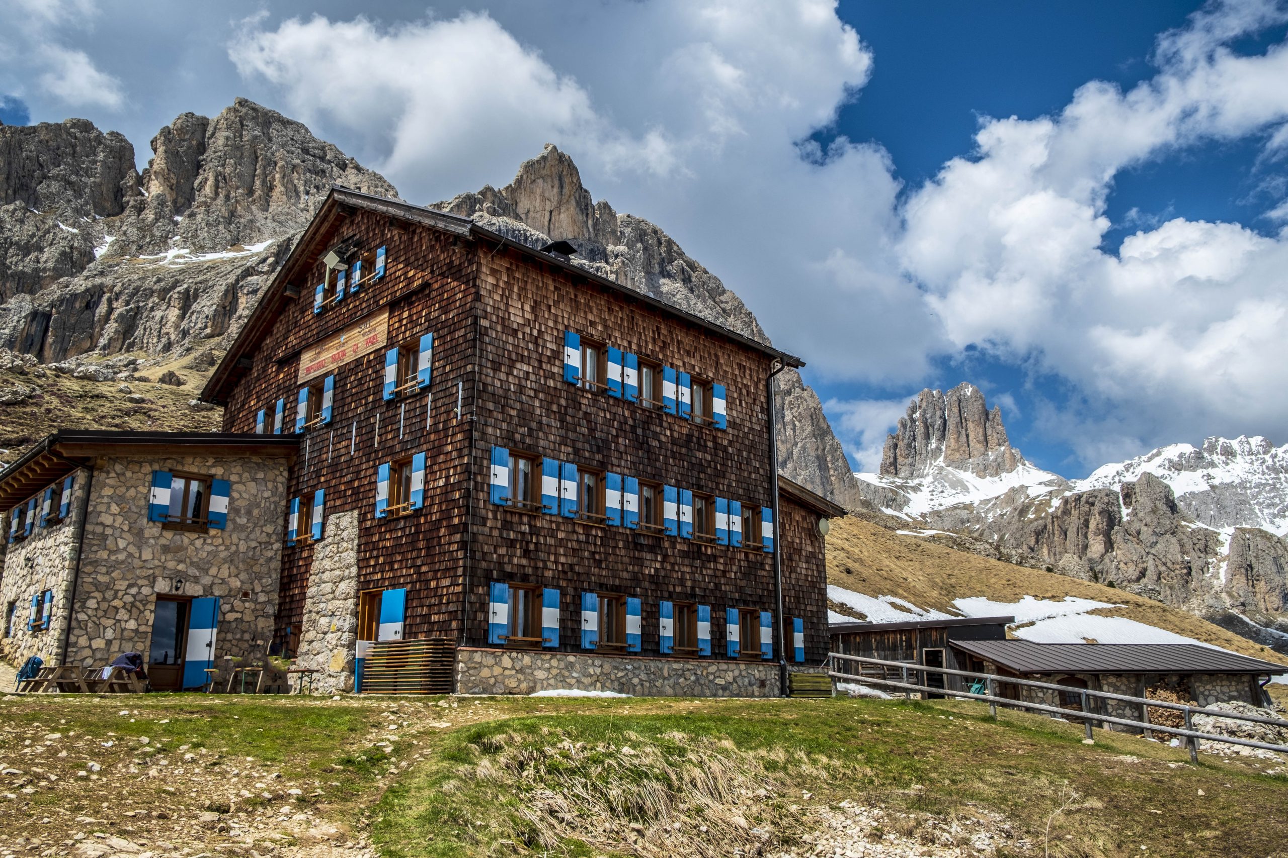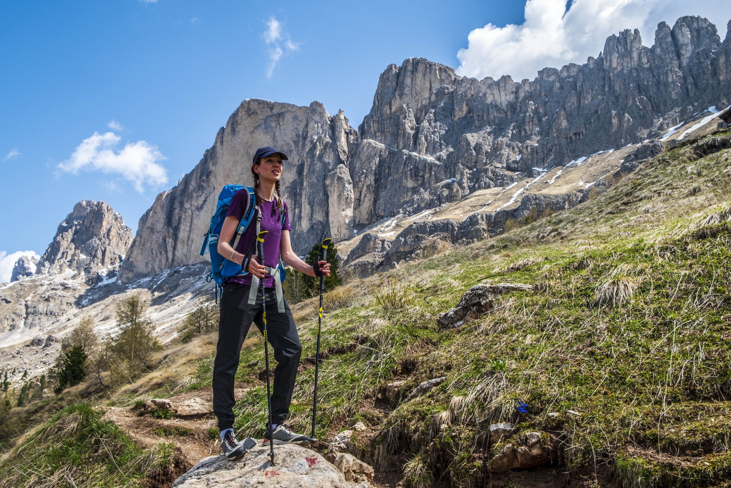La chiara parete dolomitica della Roda di Vael incombe sopra al Rifugio Paolina, prima tappa di questo percorso ad anello. Da qui il sentiero continua con la sua leggera salita nel percorso di collegamento fino al Rifugio Roda di Vael, nel tratto più roccioso e scenografico dell’intero sentiero, dove da un lato compaiono la Marmolada e le Pale di San Martino, mentre dall’altro incombono su di noi i pinnacoli e le aguzze cime del paesaggio dolomitico del Catinaccio.