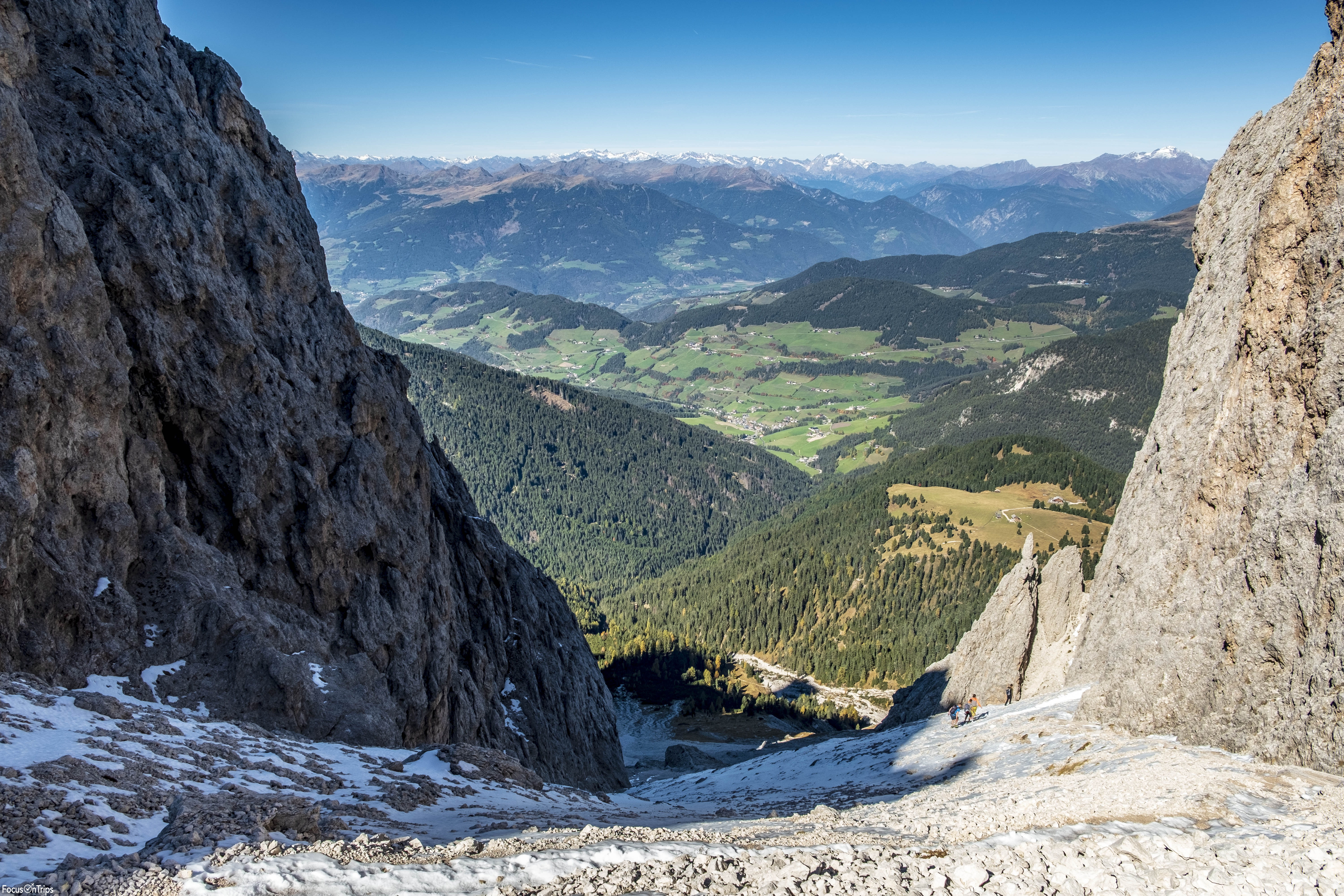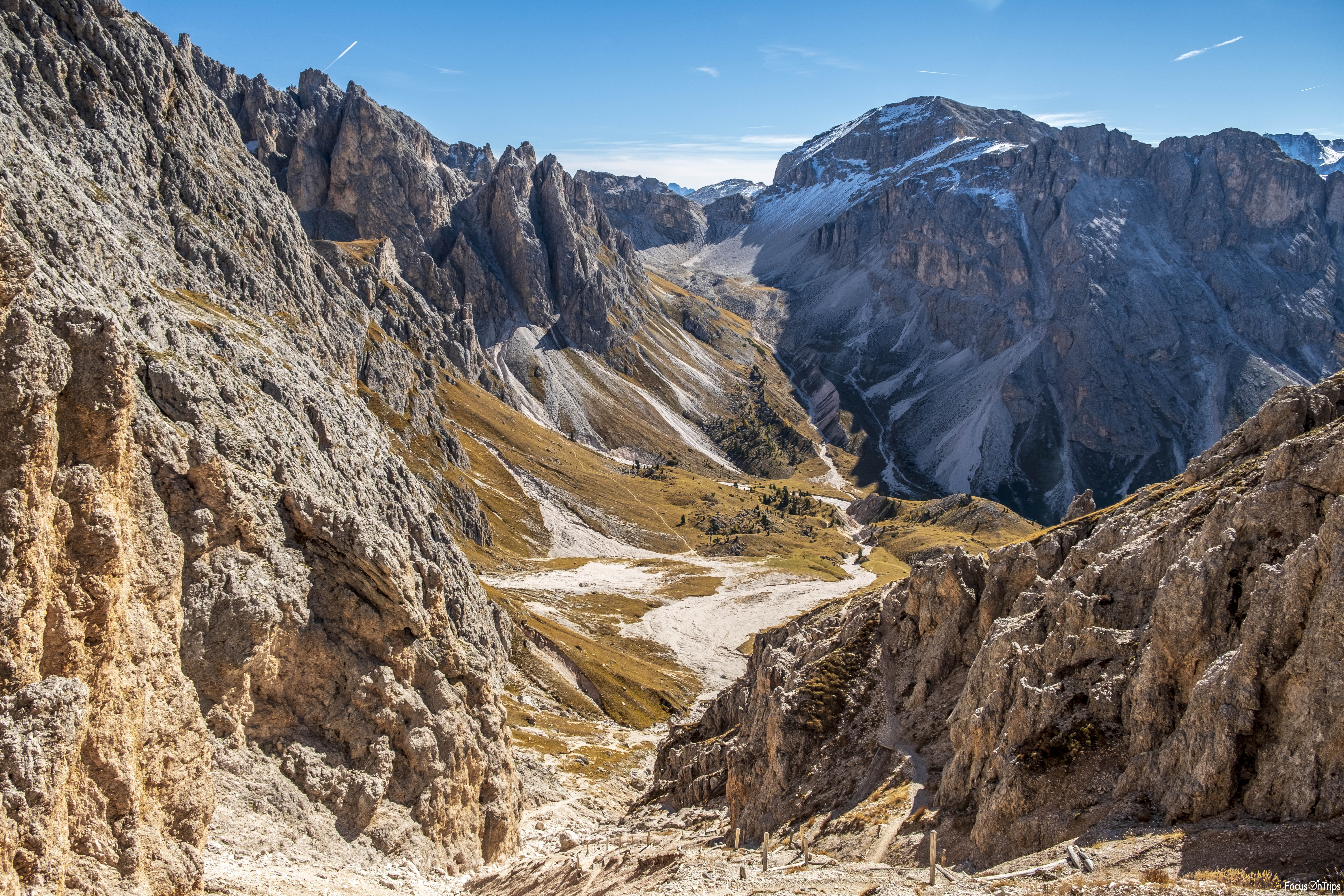 La ripida salita del ghiaione alla base della Forcella della Roa si presenta insidiosa ma al contempo gratificante per lo scenario che ci circonda. Superata la forcella, il panorama si svela nuovamente, stavolta verso la Val della Roa ed il massiccio innevato del Col dala Pieres. Una lunga discesa ci conduce così verso un grande pianoro che si stende ai piedi del versante sud delle Odle. Il sole ha nel frattempo scaldato l’atmosfera autunnale delle prime ore del mattino, dominando completamente questo vallone.