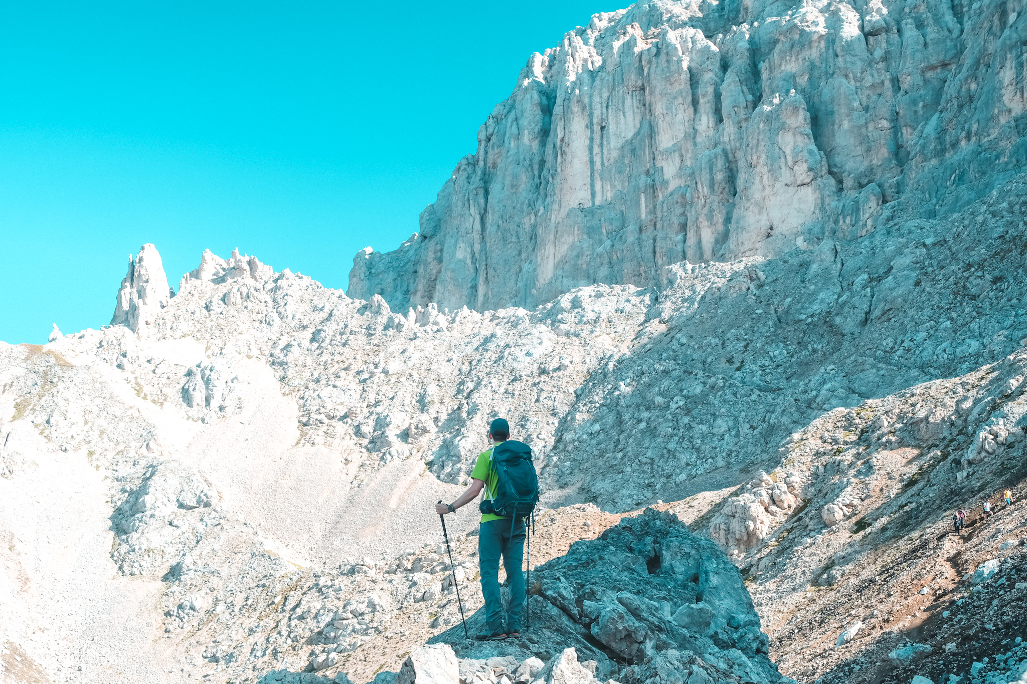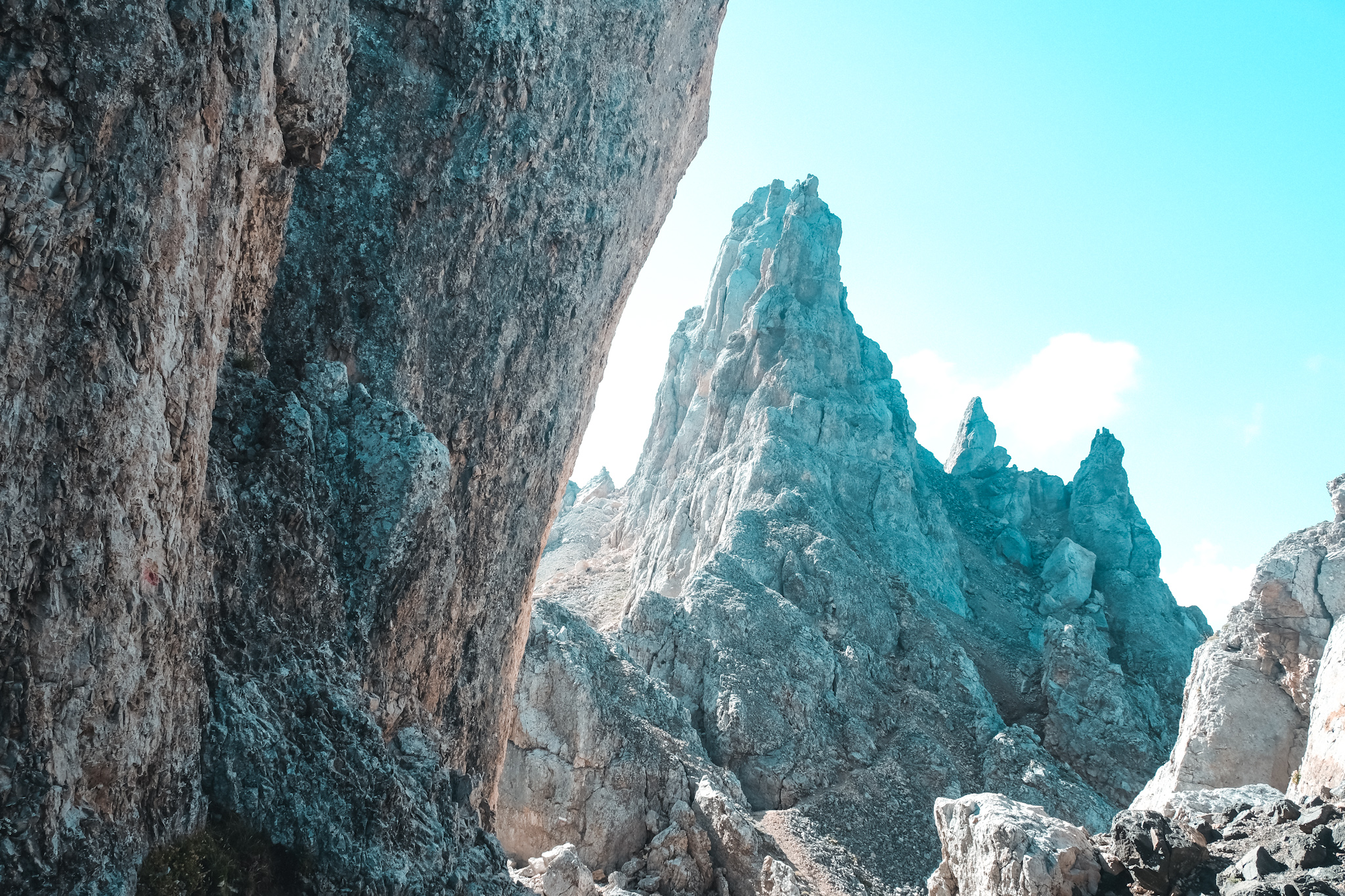 La roccia sembra così circondarci e sovrastarci, con la traccia che si assottiglia sotto ai nostri piedi è si trova nei segni bianco-rossi dipinti sui massi. Un saliscendi emozionante ci conduce nei pressi della Forcella dei Camosci (2.590 m.), con un’ultima salita ripida su rocce da affrontare con piedi e mani al tempo stesso.