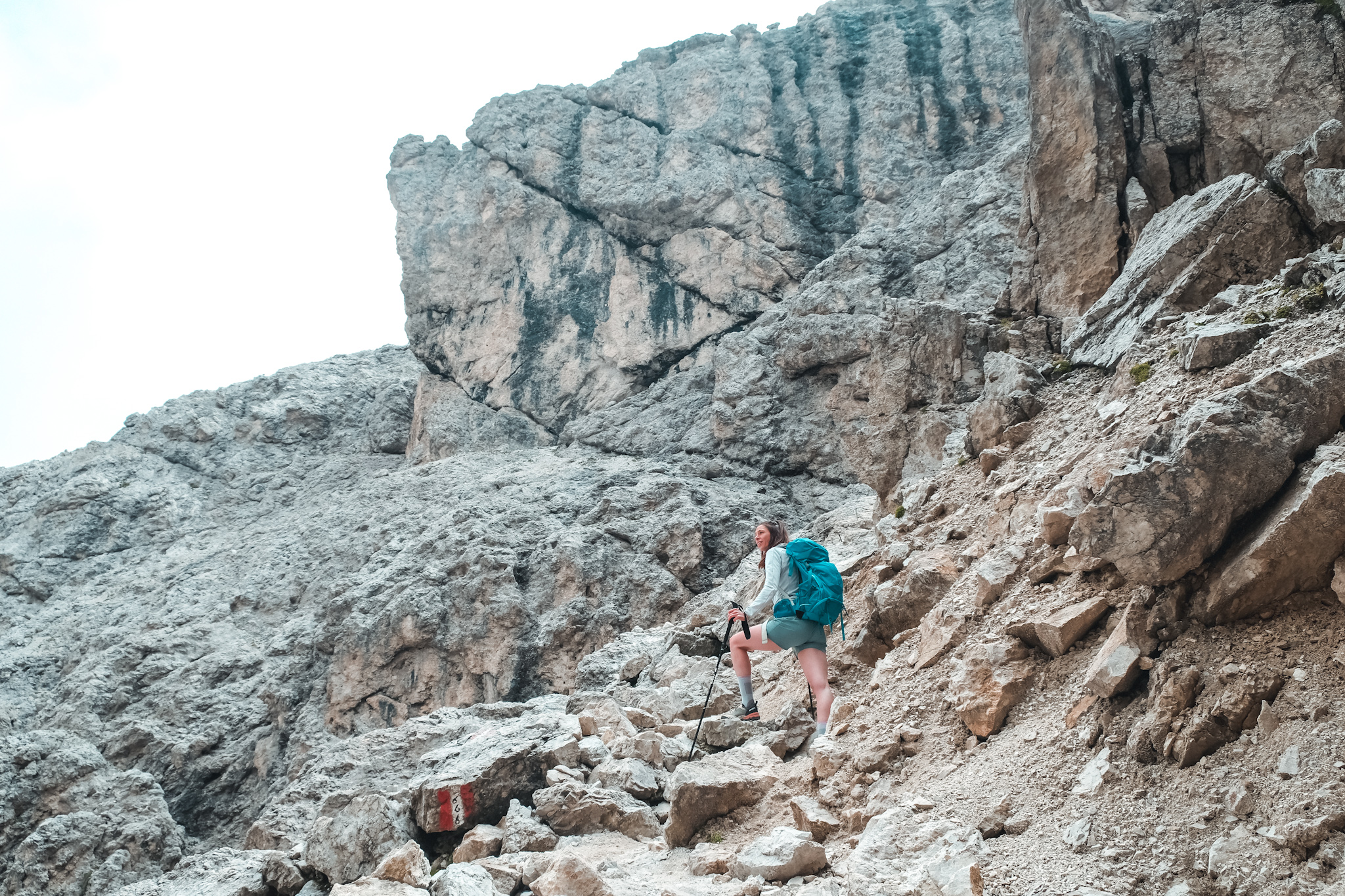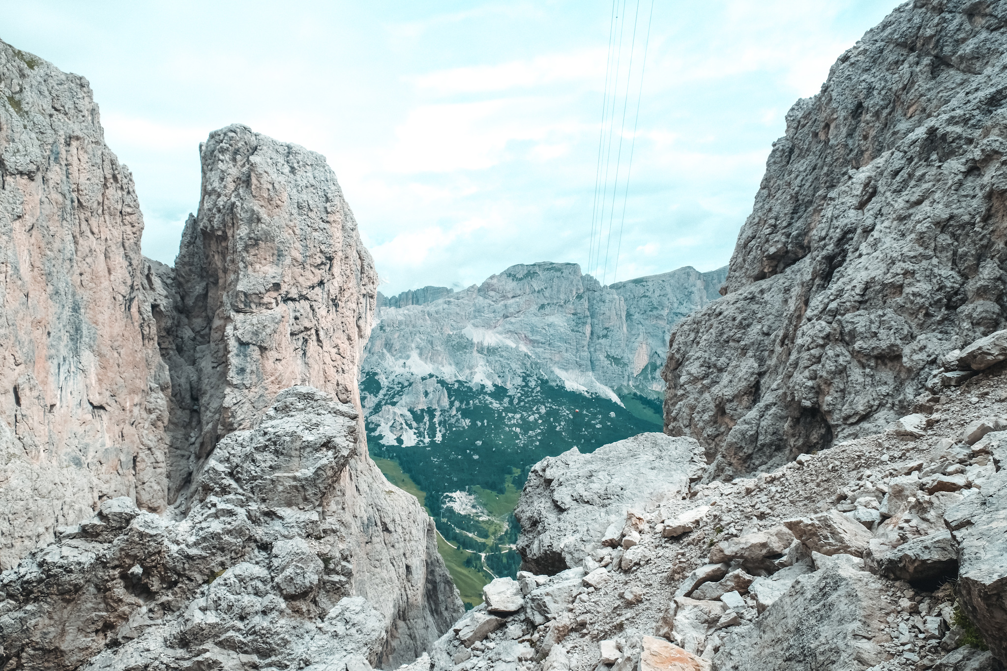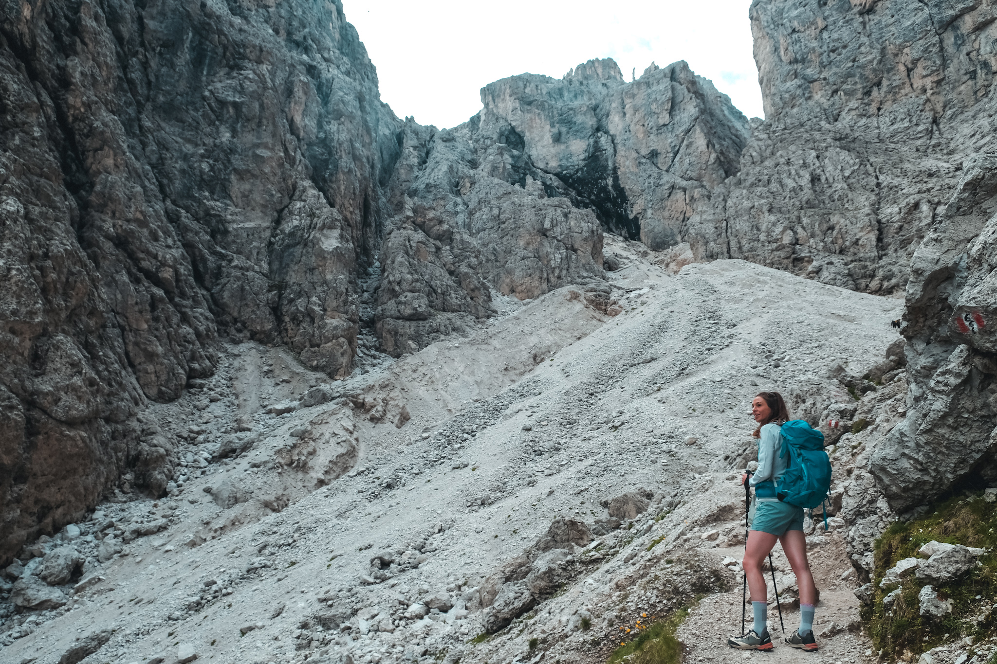 Il passo Gardena si trova a 2.121 metri di altitudine, quindi in breve tempo ci troviamo già ai margini del ghiaione roccioso, raggiungendo un bivio da cui parte la salita decisa nel cuore di un canalone detritico.