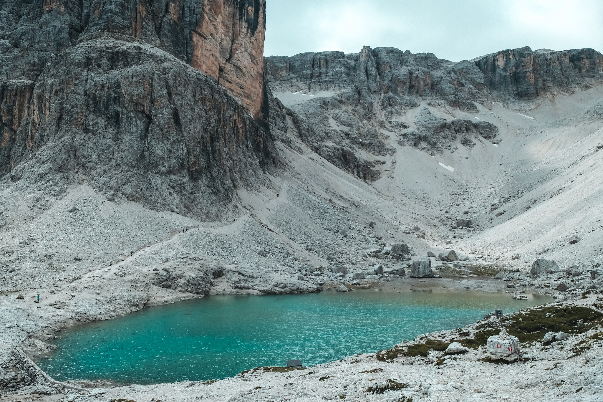 Il Rifugio Pisciadù, a 2.587 metri di altitudine, si presenta come baluardo in questo mondo di roccia fatto di torri e ghiaioni nel gruppo del Sella. Un quadro incredibile, completato da un laghetto e dal suo azzurro chiaro che catturano lo sguardo, con la pallida roccia dolomitica sullo sfondo.