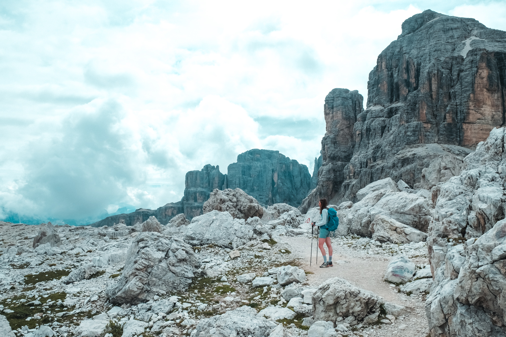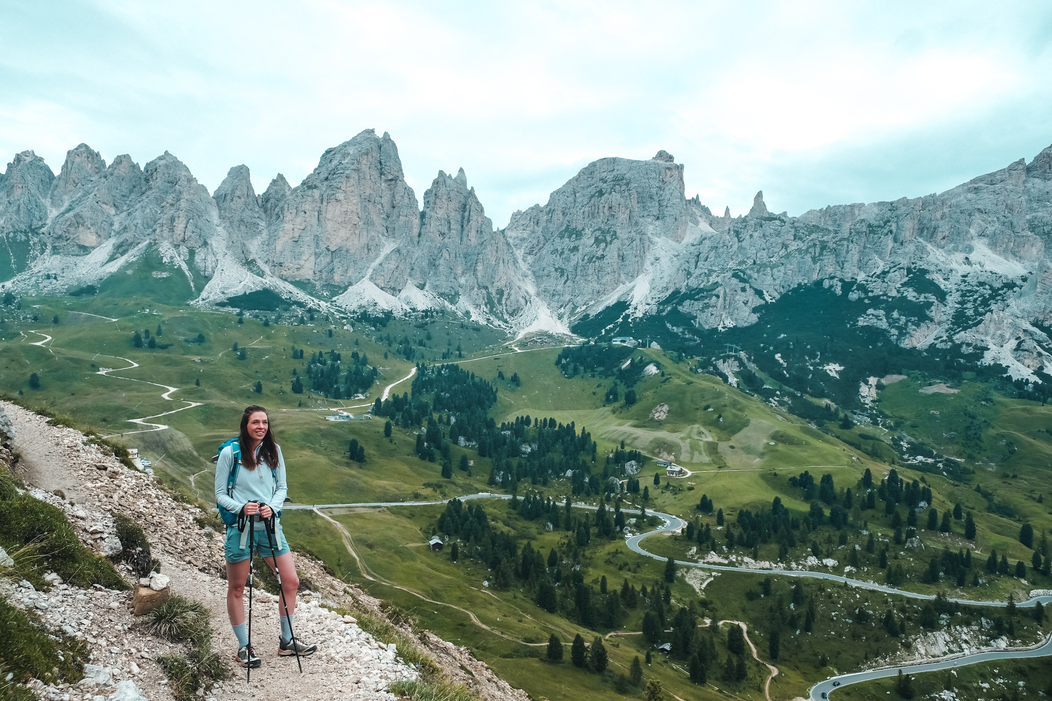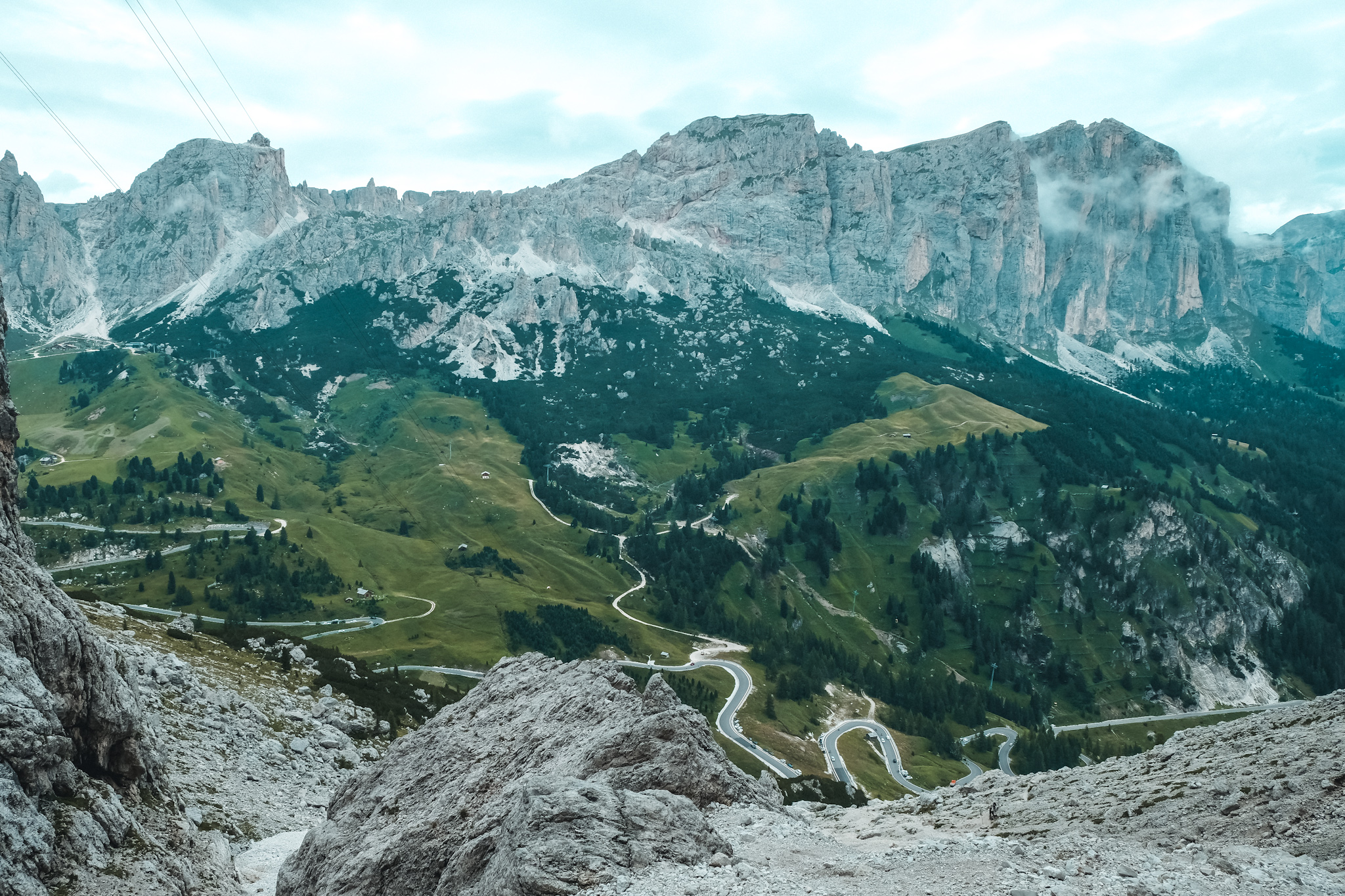 Ci troviamo al passo Gardena, che collega in Alto Adige la Val Gardena alla Val Badia. Si tratta di un passo incastonato tra i gruppi dolomitici di Sella e Puez, con la strada asfaltata che attraversa in alcuni punti i ghiaioni dolomitici. Il cielo si copre con nuvoloni grigi e carichi di alcune goccioline di pioggia. Ci fidiamo al tempo stesso delle previsioni meteo, con la giornata che dovrebbe concederci una finestra temporale per camminare senza pioggia.