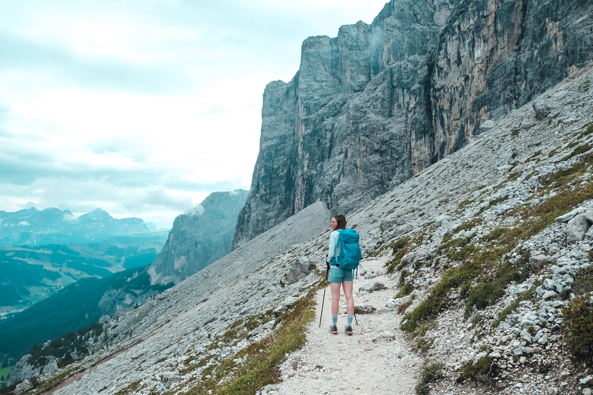 Siamo alle porte del regno di roccia delle Dolomiti del gruppo Sella, nel loro versante settentrionale. Nel primo tratto di sentiero attraversiamo i verdi e ripidi pendii che circondano il passo Gardena, percorrendo uno stretto percorso che sale con varie curve decise. A mano a mano che la salita prosegue, ci avviciniamo poi alle pareti rocciose.