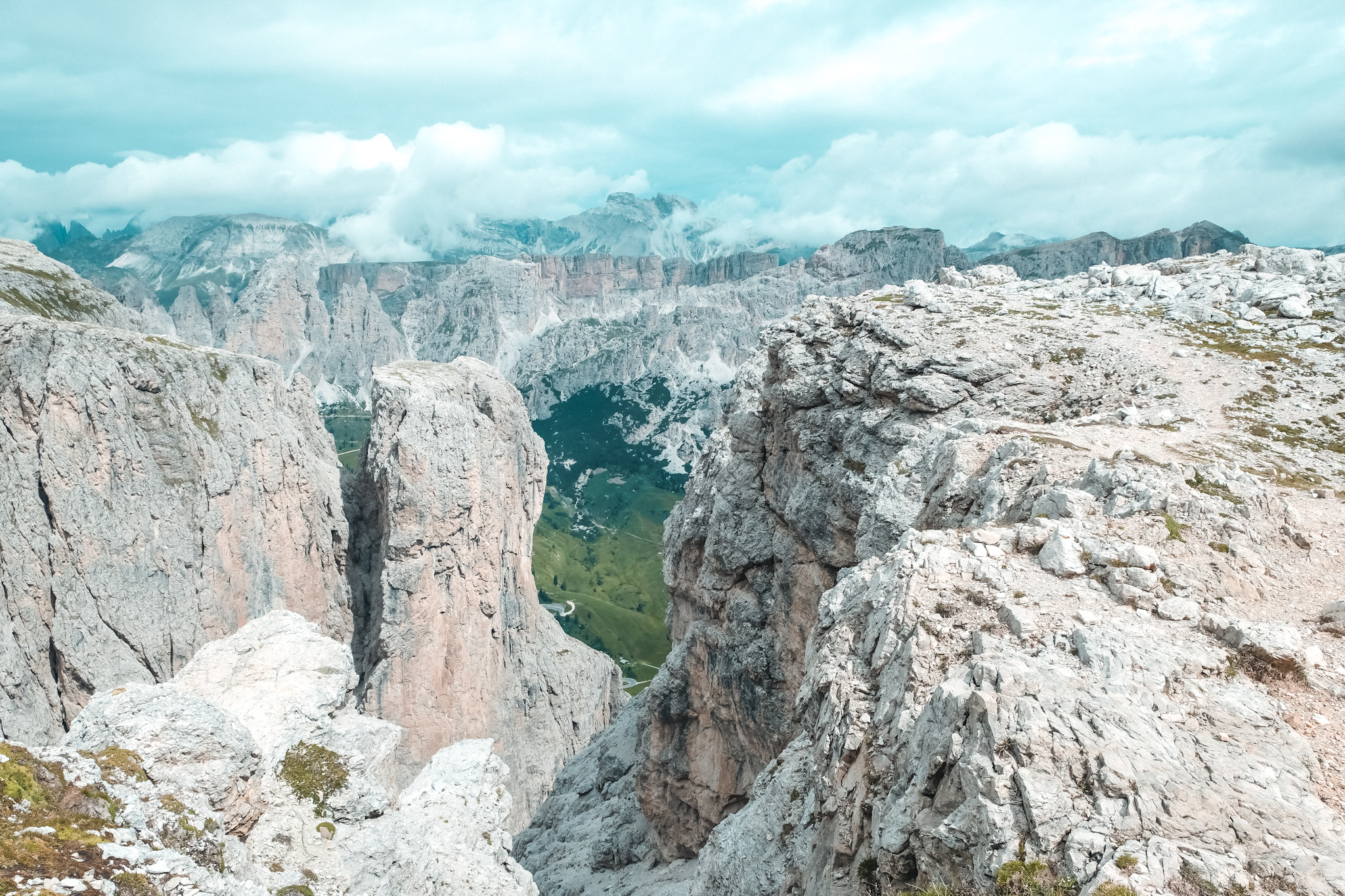 Con la testa focalizzata sulla roccia sotto ai nostri piedi e sotto alle nostre mani, ogni tanto gli occhi riescono a catturare scorci del panorama che si crea alle nostre spalle. Dalla profonda apertura del canale roccioso ammiriamo verso nord le pareti del Puez, che emergono tra le nubi.