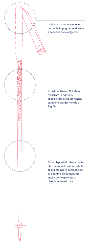 Queen G è la special edition di bastoncini da sci freestyle disegnati in collaborazione con Silvia Bertagna, campionessa di Big Air! Corti, e con un'impugnatura adatta alle competizioni di Big Air e Slopestyle, e dal design unico. Siete pronti per un giro al park e ad assaporare l'adrenalina del primo trick?